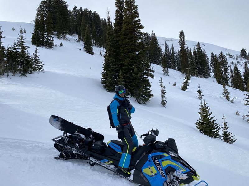 Remote triggered avalanche by snowmobiler. Crown is on ridge above and far behind snowmobiler in picture.