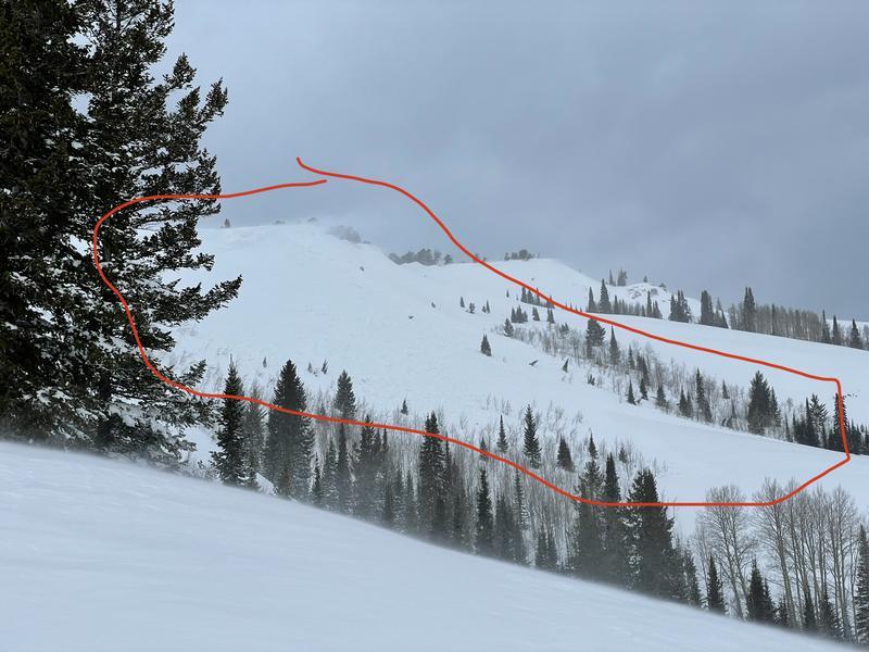 Observed from a distance. Difficult to tell details as the wind was so strong and blowing. Likely natural but could have been triggered remotely from snowmobile traffic on the ridge above.