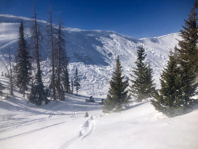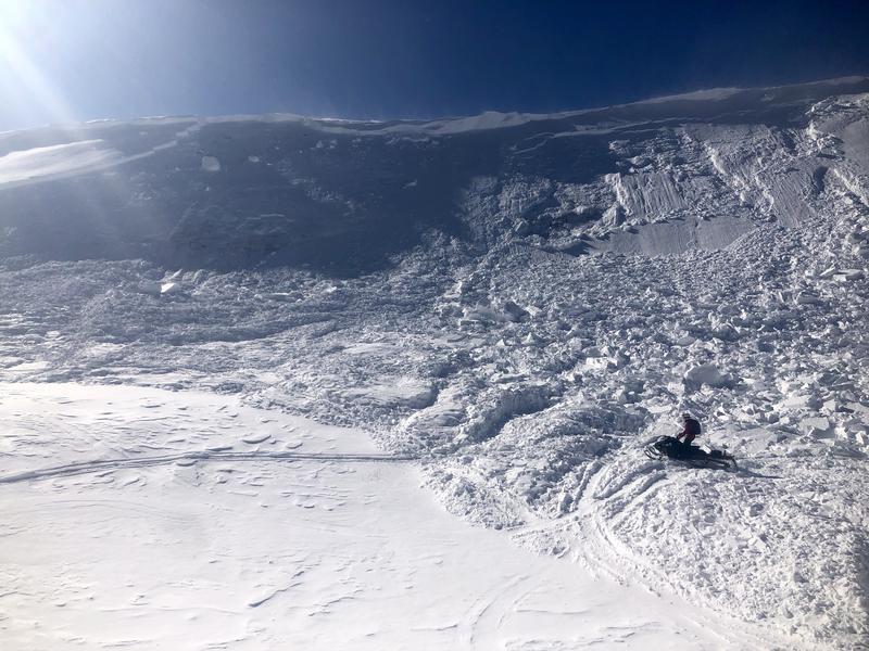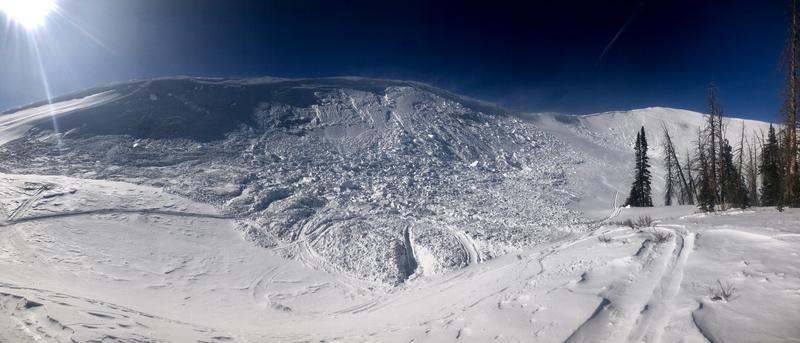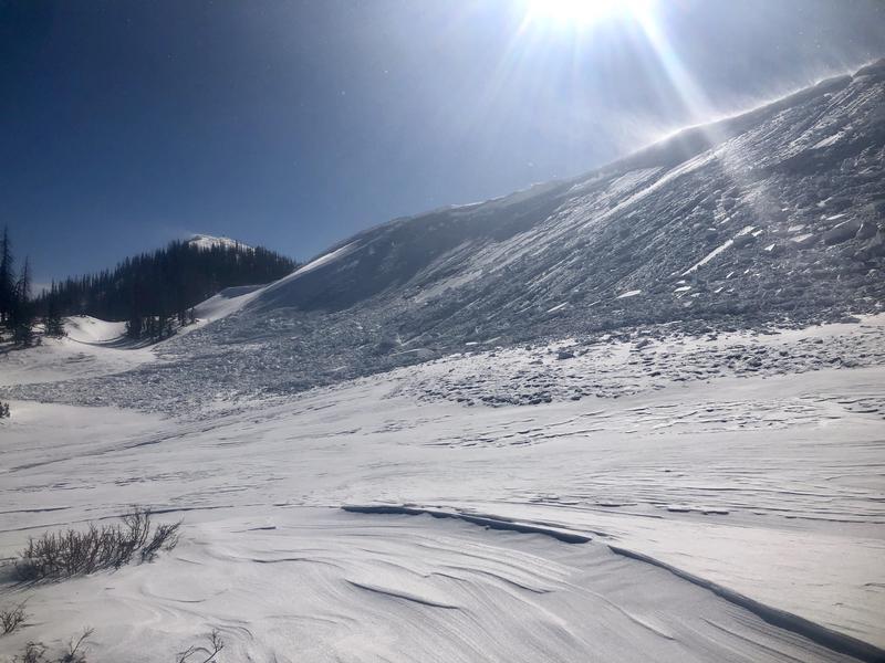 There are two separate slides in these images, but both share similar characteristics. Both slopes were heavily windloaded, and were on the north half of the compass. Slab size was similar to other pieces of snow observed today, taking a majority of the snow on the slope down with it. Not a large avalanche in terms of size, but the bench feature and steep transition at the bottom of the slope increase the consequences of being buried. Avalanche stepped down to the ground in places, similar to the trend.