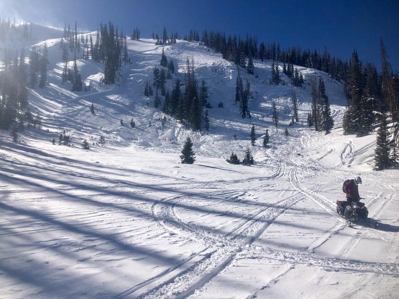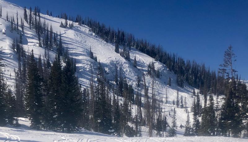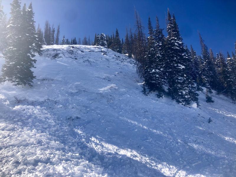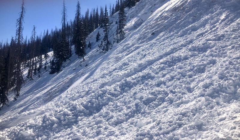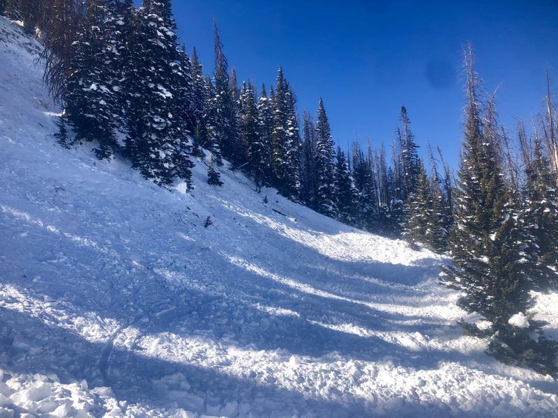 This slide has previously been observed, but we went today to take a closer look upon our travels. An impressive avalanche and even more impressive deposition. Debris stacked up on the bench in the right hand corner of image 1. In places, it was nearly 20ft deep, no chance a probe would feel the ground there. Large timber was ripped out and moved down slope, and was quite a mess of an avalanche. Any more details from the party on the events of such would be rad to hear! Glad everyone is safe.