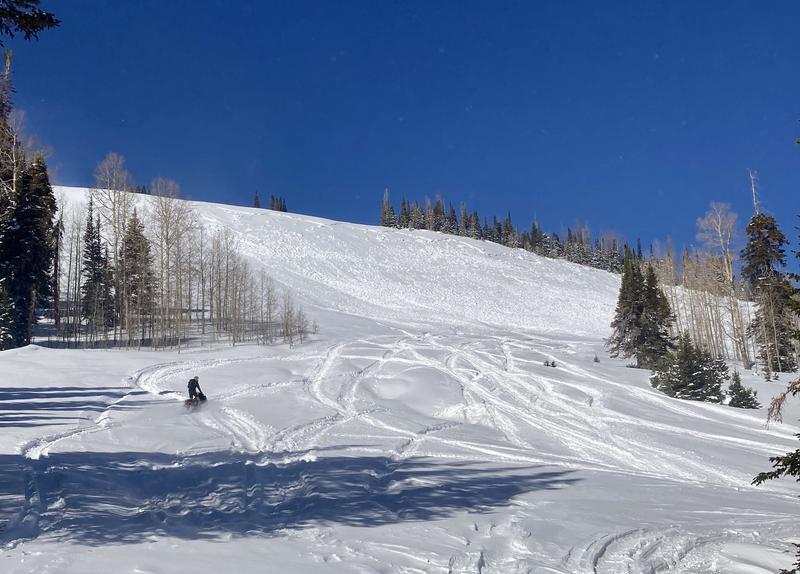 Came across this wind-slab avalanche SW of Mill Hollow Reservoir at about 9800' on a SE facing slope. We did not witness the slide, but it appeared to have been triggered by a snowmachine yesterday evident by a high-mark track roughly 30' below the crown on the lookers left. No signals were picked up with our transceivers in the debris pile.