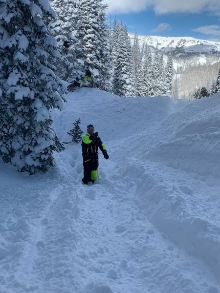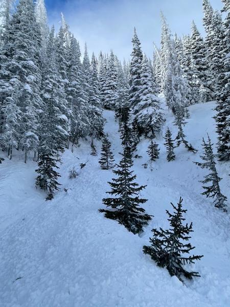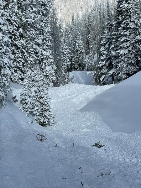 This slide was triggered by snowmobilers riding in this gully. They were not caught. It's unclear if it was 3 seperate slides or one large one.