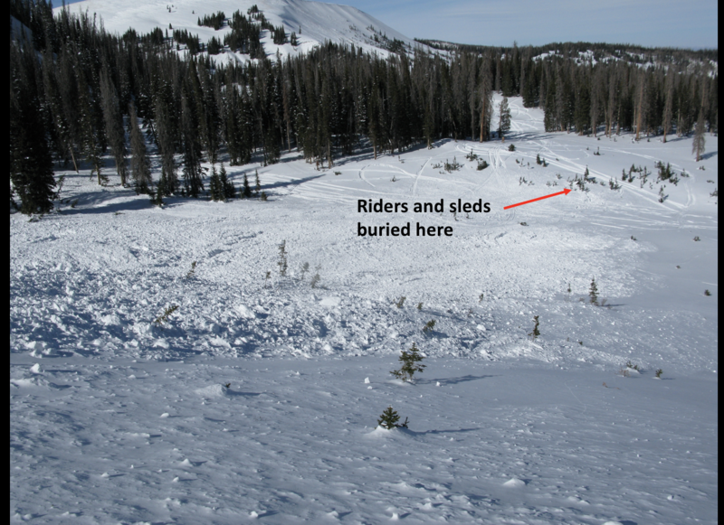 A group of 6 snowmobilers were involved. At least some of them are very familiar with the area. 4 were partially buried. 2 were able to ride away from the avalanche.