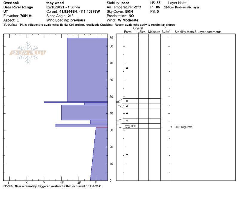 On 2-10-2021, I (toby) examined the avalanche. Stability tests on an adjacent slope showed unstable snow conditions. There sure are lots of similar slopes in the area, which are suspect. This one ran onto a very low angled slope and stopped, but there are numerous drifted slopes nearby with longer runs of sustained 30 degree steepness...