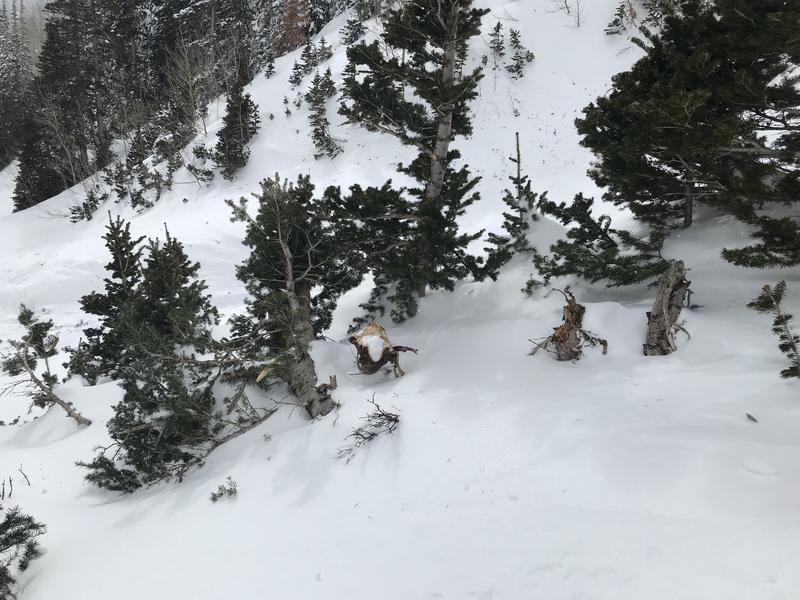 Very impressive, tree snapping natural avy which looked like it ran very early this morning. Not particularly deep, but quite connected, pulling the rug out from the ridges and entraining a tremendous amount of volume.