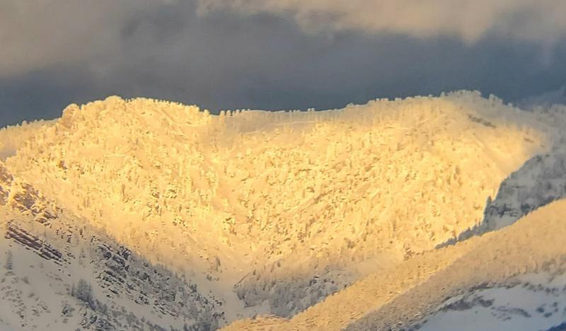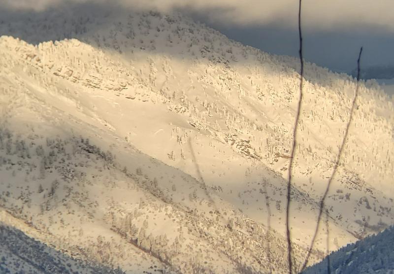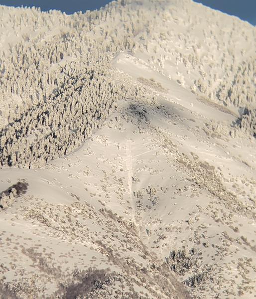 As much as we would have loved to be out today playing in the new snow, we tried to be responsible idiots...I mean adults, and stay home. It was rough. This evening right before the sun set, the clouds cleared for a few minutes and we were able to capture a few pics through binoculars of avalanches along the west facing slopes of the the Bear River Range. The pics aren't great but we were able to witness natural avalanches everywhere. They looked very large and widespread along most of the range we could see. We saw slides at the upper end of Smithfield canyon (backside of Cornice Ridge), Upper Birch Canyon, Smithfield Dry Canyon, and others. Possibly 100's of yards wide and i would guess fairly deep since the crowns were easily viewed through binoculars from across the valley. I guess it was a good reminder of why we stayed home today. Be safe out there all!