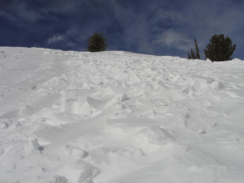 Today the NE wind was on strong all day blowing old growth beetle kill down and lots of snow creating wide spread fat wind slabs. Wind slabs were prevalent on all aspects in the upper elevations.