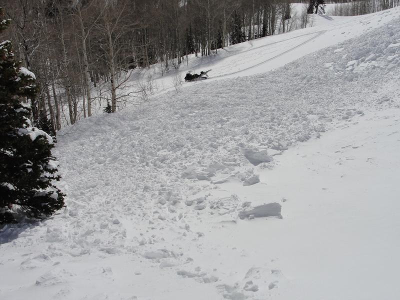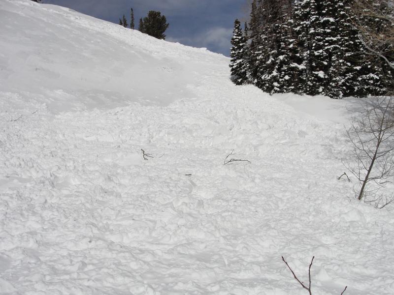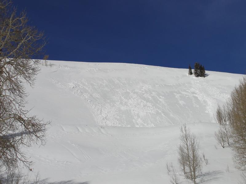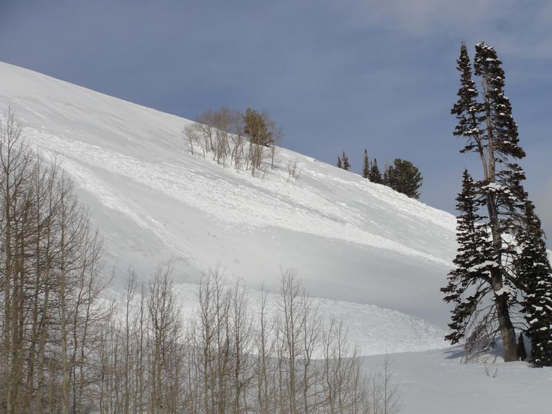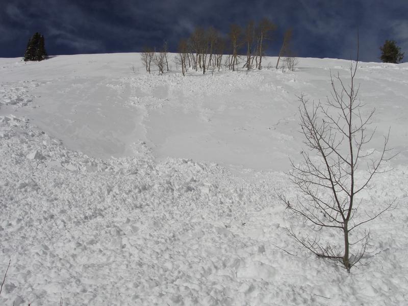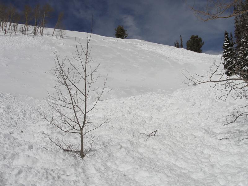 I discovered this 700ft wide hard wind slab avalanche on my way down the mountain today. The bed surface comprised of cohesive small grains, no crust. This appears to have slide on a density inversion within the last few weeks of snow. The debris pile was over 3 meters deep. I did not get up to the crown so I'm not sure about the slope angle. I inferred 32 degrees by measuring the angles in the pics.