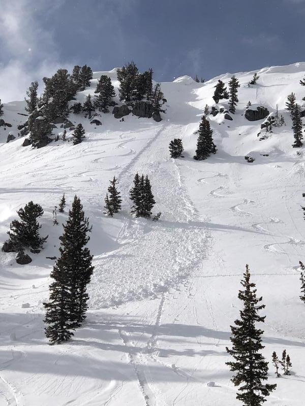 Party of skiers looked to have triggered this wet loose slide, likely with a slope cut. We saw the group ski from afar and noticed the slide after exiting the area later in the day. Unlikey anyone was caught or carried in this one, but we noticed much more intimidating wet loose activity on longer, steeper, and more southerly facing runs at the end of the day.