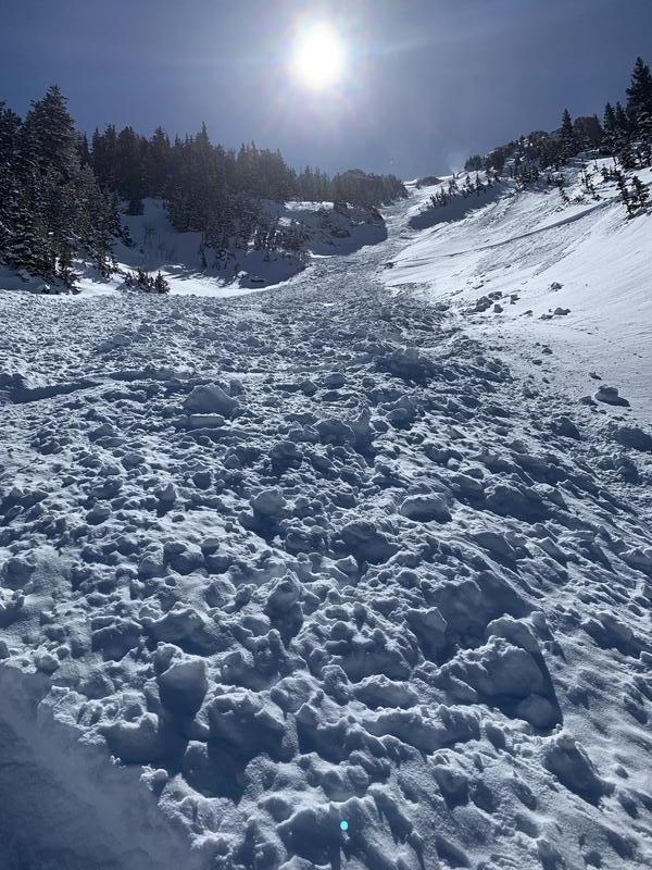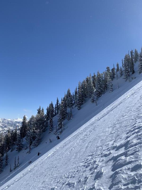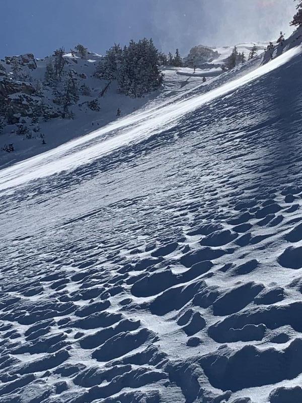 All three parties had noted earlier in the morning the higher than anticipated wind at the summit and had discussed possible changes to their plans depending on the loading and layering that was observed once in the line. All three parties traveled to the top of the protected skintrack in the trees to climbers right before discussing options for crossing into the main run to continue their ascent. All eight skiers crossed the main run one-at-a-time to a relative island of safety on climbers left where the intention was to further examine the wind loading. One party of three and the party of two ascended from this point approximately 50-100' and began transitioning to bootpack. The other party of three made the decision to descend from this point based on concerns about the snowpack. The first skier from this party was descending the skiers left side of the run when the avalanche was triggered above and was able to safely ski to the trees on the left before re-ascending to check on the two caught skiers.