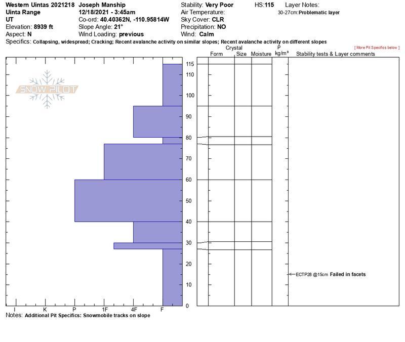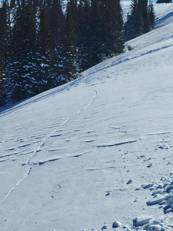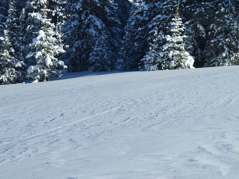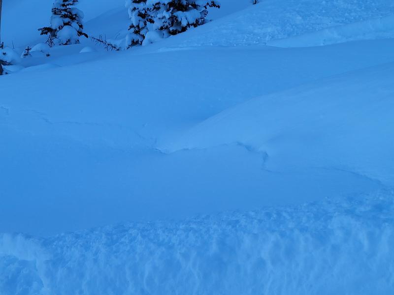 We also noted wide spread collapsing and many shooting cracks on slopes harboring old facets. These cracks would spider web out and if the slope was a little steeper, would have produced an avalanche.