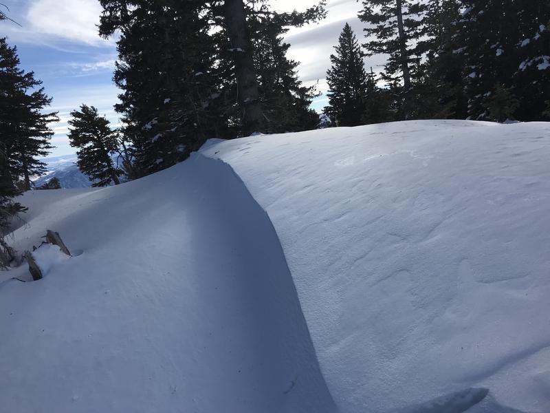 A skin-track went along the ridge above the avalanche and then to the west and towards pt. 9248. I could see that the slope just below the uptrack and to the west had collapsed and cracked extensively but had not avalanched because of a lower slope angle. Cracks were visible across the slope, hundreds of feet away from the avalanche.