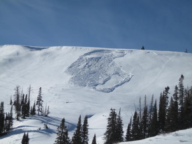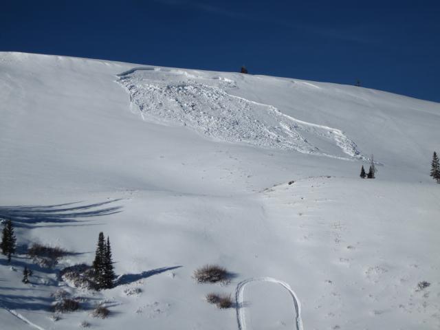 This natural avalanche likely occurred sometime yesterday with an increase in winds from the south. It looks as though the slope naturally avalanched during the storm mid week and may have only involved new snow while this newer slide broke into buried weak faceted snow possibly from a cornice fall. Many slopes throughout the Whitney Basin avalanched naturally during the mid-week storm, these were all on north through east facing slopes.