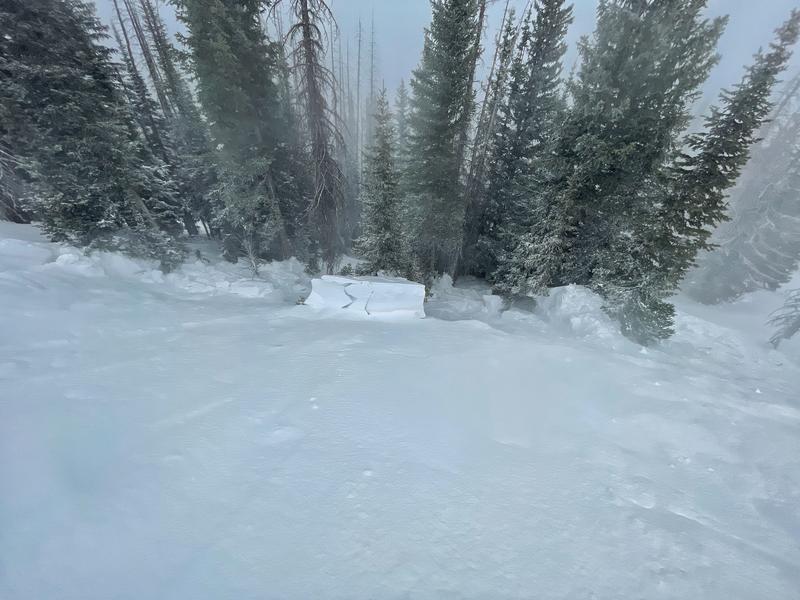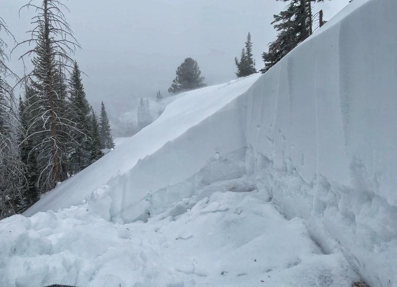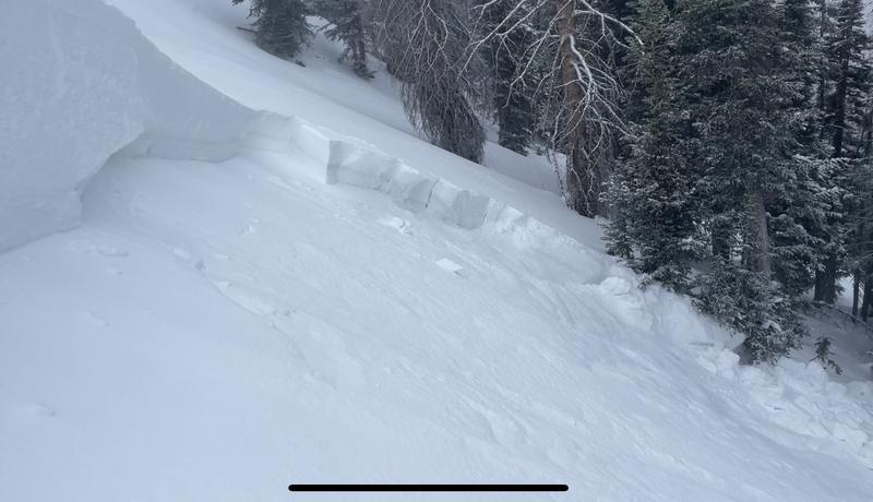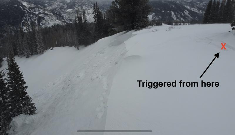 I approached the top of this slope and triggered it from above. The collapse and cracks extended about 200 feet to one side of the slide and 100 feet to the other side. SO! Even though the slide was only about 100 feet wide, the extent of cracking told me that this snowpack could have easily produced a slide 400 feet wide or more if there had been more of the slope that was steep enough to slide. It was less than 30 degrees on either side of the flanks.