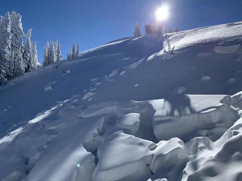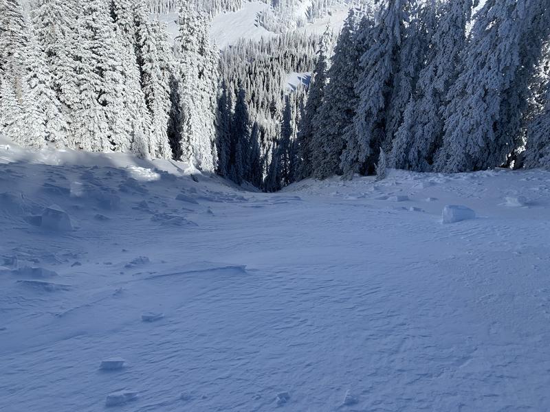 Vertical is unknown, I could not see the valley floor below Coyote, so I don't know if it ran full track. I could not see a Stauchwall, so it definitely ran a long way. 2mm well developed facets from the October snow is the weak layer. The bed surface was covered by the five inches from 11/24. The avalanche was the full width of Coyote chute and potentially full track. This is an older slide, but today the slab is 1 finger in hardness so I classified this as a hard slab. HS-R4-D2