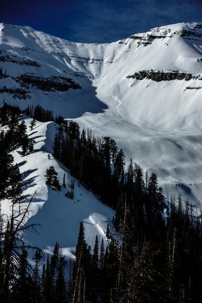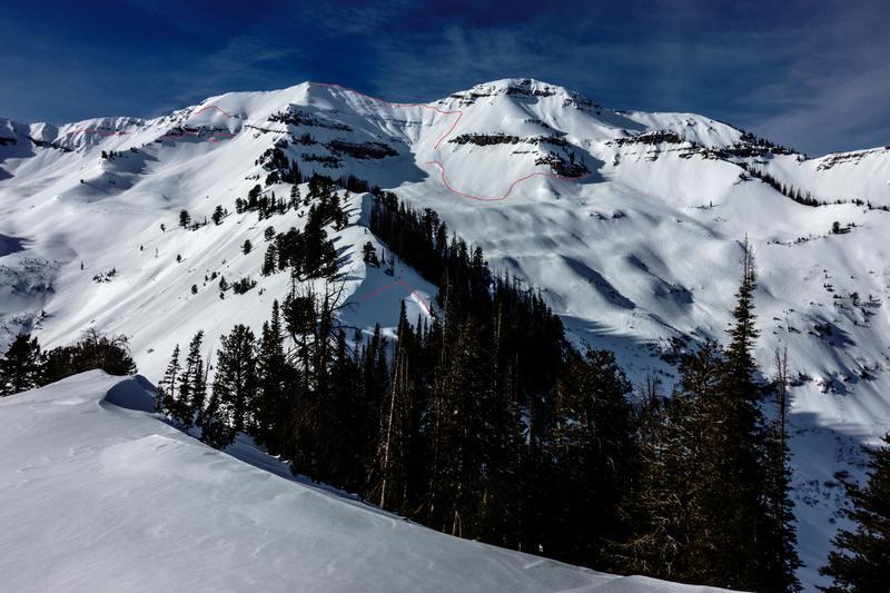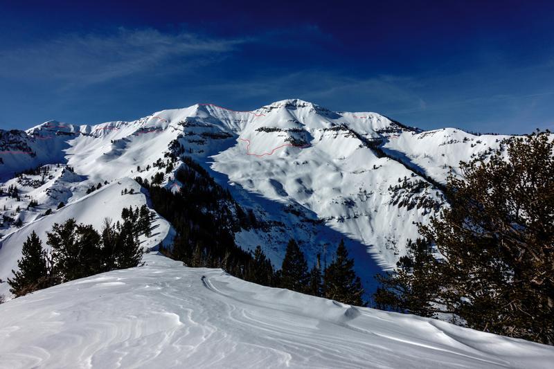 Just about everything steep that faces north through east looked like it had released; many were smaller, shallower looking pockets, some a fair bit bigger, and one monster off of the ridgeline that looked to have a crown near 6' high and had debris that ran all the way over the bench below and out of the frame of the photos. I included photos with and without crown lines highlighted in red, for clarity.