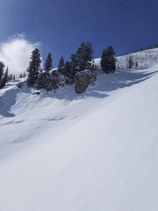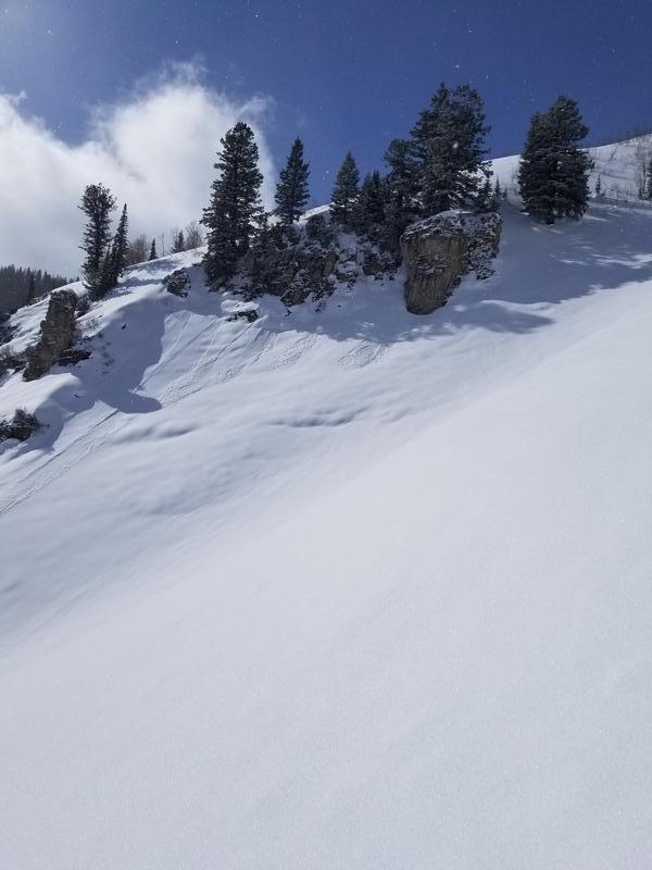 Observed several wet slide(?) avalanches that appeared to be 1+ days old. Starting location was below rock outcroppings. The largest (not pictured) appeared to be about 40' wide and 150' in length.