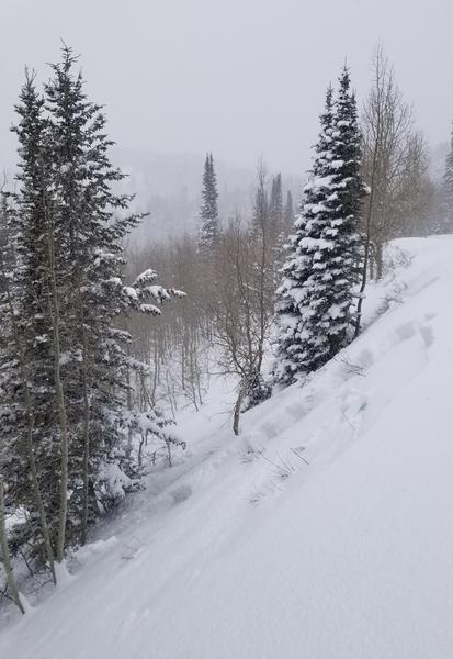 We skied the large bowl beneath the prominent cliff band / amphitheater on the way to the base of cold fusion. We ventured into the zone with the intention to ski Cold Fusion (CF), however, under the impression we likely would not be able to ski the line given storm snow and wind slab issues. The overhead danger in CF was a notable deterrent.
