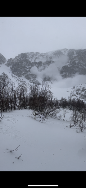 After deciding to turn back from CF, we skied the near the bowl under the amphitheater on low-angle, shallow powder conditions. There however, we observed 4 separate large avalanches that descended from the top of North Timp and cascaded down the face of the amphitheater. These avalanches were natural triggers descending from the top of the peak and entraining large amounts of dry loose, storm snow. Two of the 4 were large enough to produce audible booms and all 4 exhibited large, fast moving powder clouds. Investigation of the debris from a safe distance indicated small depths of debris but were very wide and easily could have knocked somebody over and buried them in dry loose. There was no slabby nature of the debris but the form of snow from the start zone was unknown. Potential wind slab release but likely release of the storm snow on the old snow interface which gained momentum by the steep, 50 degree + slopes it traveled on. These large avalanches on a Destructive (D) scale were small, likely lower that 1.5, but on an Relative scale (R), potentially up to R3 based on the length of the over head area cleared out. These avalanched happened on the same slopes all within an hour of each other and entrained snow at the base of the cliffs in shallow, slow, short running dry loose avalanches (max 80 ft wide, max 200 ft long).