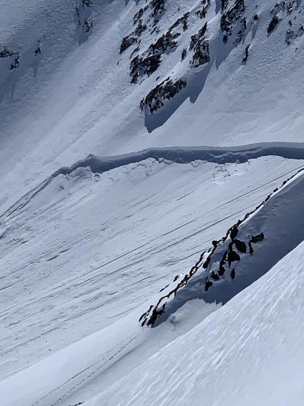 Small LW triggered a SS-N-D3; my partners thought it looked like a hard slab, I thought it was size 3.5 so we are meeting near the middle. Appeared to have happened just before our arrival in the morning on 3/1 or possibly sometime on 2/28. Crown was 3'-5' deep and still very sharp. Couldn't see the toe of the debris but assume it ran down to around 8800' based on the shape of the terrain. This seemed like a notable event.