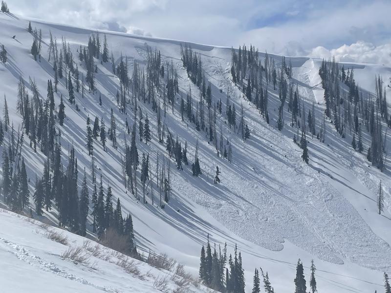 Two sledders were riding in Blue Slide. They were purposely avoiding the steep slope that slid. One rider was climbing a lower angle adjacent slope when his engine bogged forcing him to turn downhill. This pushed his trajectory towards the bottom of the steep avalanche path and the avalanche released above him. He grabbed some throttle and outran the avalanche which did cover part of his track.