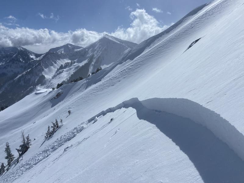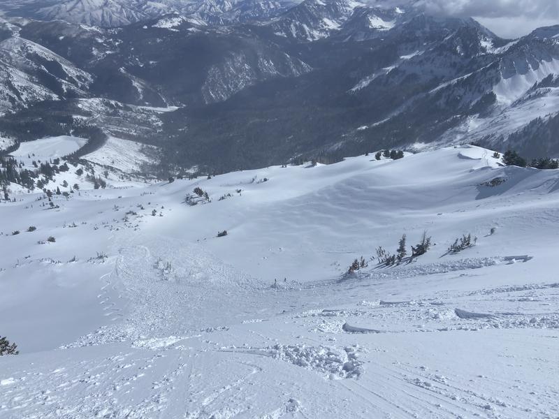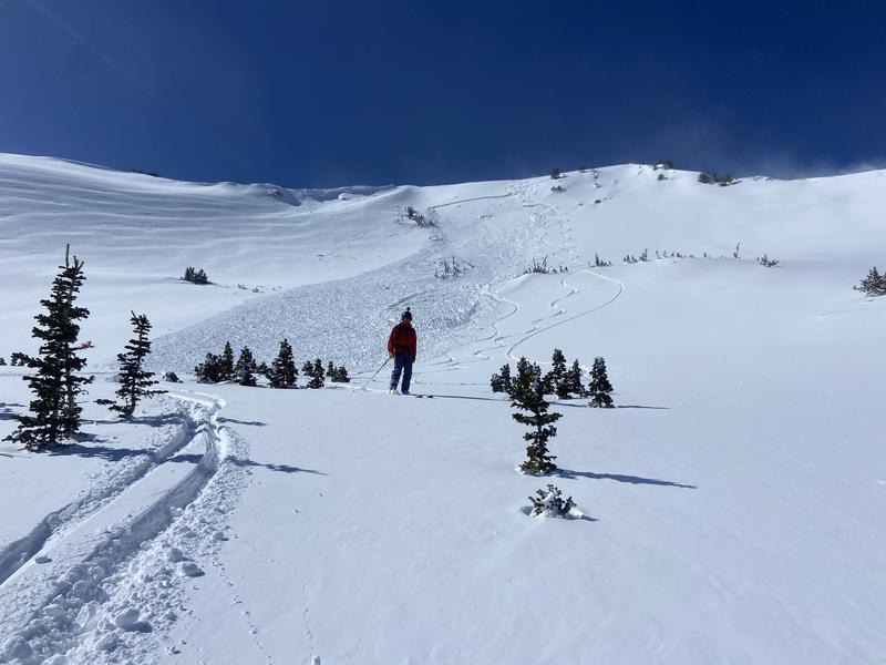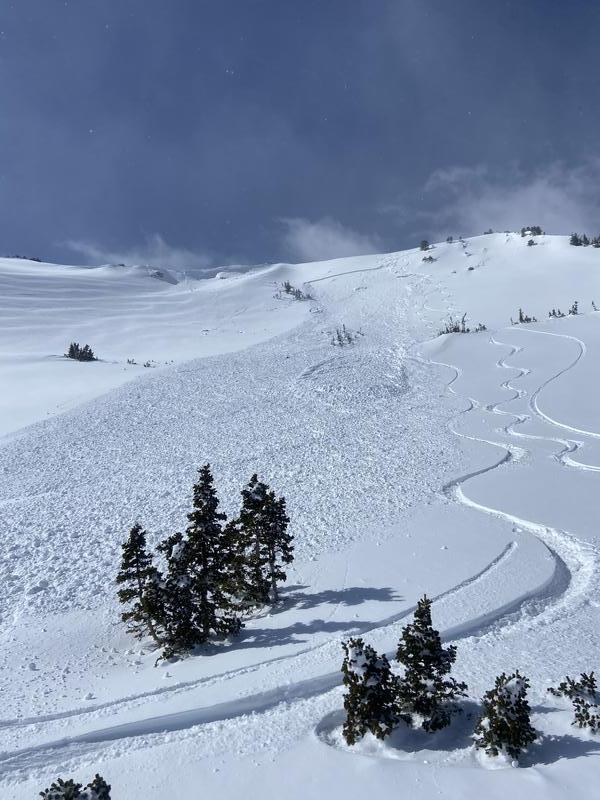 Went up to silver lake peak to ski the south East face today. After skiing one lap from the summit we had some great creamy turns, didn't expierence any signs of instability, and went back up for more. On our second lap we planned on skiing directly next to our previous tracks which was just to the west of our first run- and had a slightly more south East facing aspect. The first skier in our group skied down and after about 10 turns heard a loud noise, looked back to see the avalanche, and was able to straight line down to a zone of safety. We skied the debris down, regrouped, and called it a day. Very thankful to all go home safe and sound today.