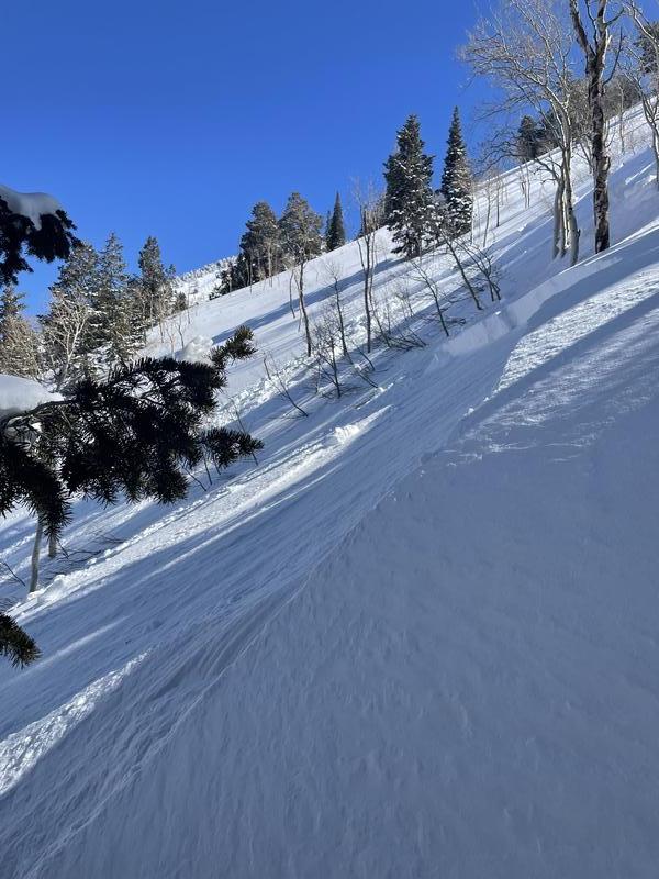 As we ascended through the trees a womf crack we beleive caused a remote trigger in the nearby concave wash. It ran maybe 80'. No one was caught or harmed. We cut our losses and turned back.