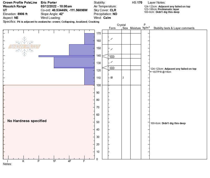 I'm guessing this was remotely triggered on 3/10 by the snowcat when they groomed the road, but don't have confirmation on that. The crown looked like it was a day or two old. Slope is around 42 degrees ENE facing.