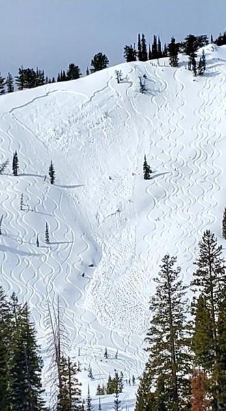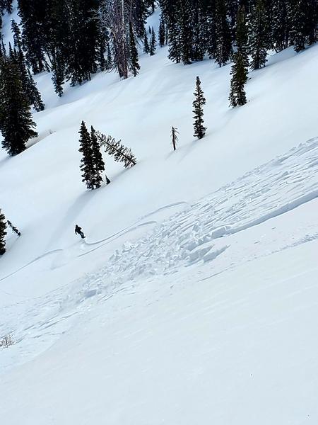 I followed Eric but dropped the ridge in a slightly mellower spot to the south so I could get a better look at the slide. On the next lap I again was spotter from the peak. Eric dropped in just south of my previous line. He was 6 or 7 turns in when the rest of the wind slab released. Luckily I was immediately on the radio and he strait lined it out of there. This second slab was much bigger and scarier. In total, the slab was somewhere in the neighborhood of 120' wide. The crown, at the deepest, was about 24". This one ran 500 vertical feet and piled up 4-5' deep at the bottom.