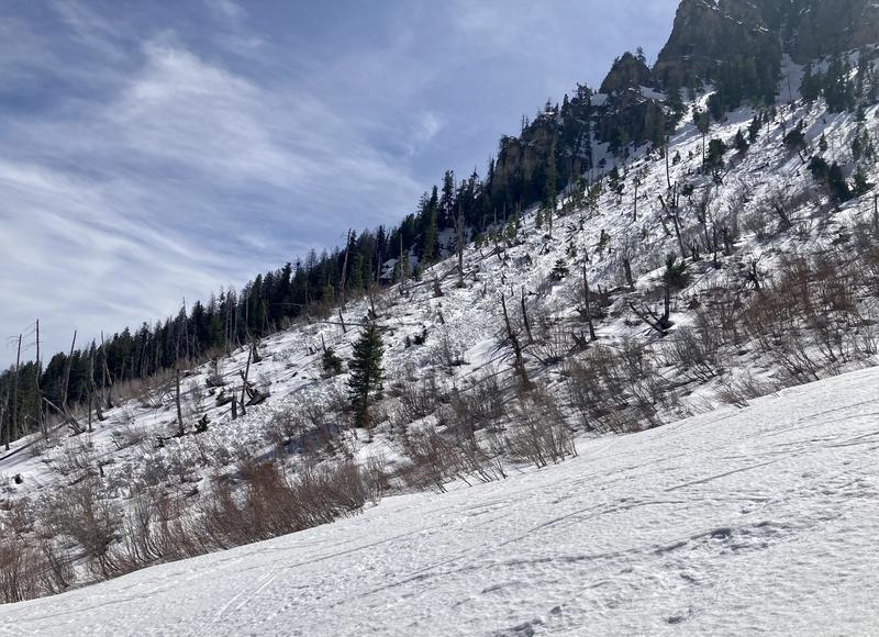 We observed this wet loose avalanche on a N facing slope in the Aspen Grove area around 13:30. We expect the avalanche initiated around 8000', and was able to entrain a lot of snow which left a sizable debris pile.