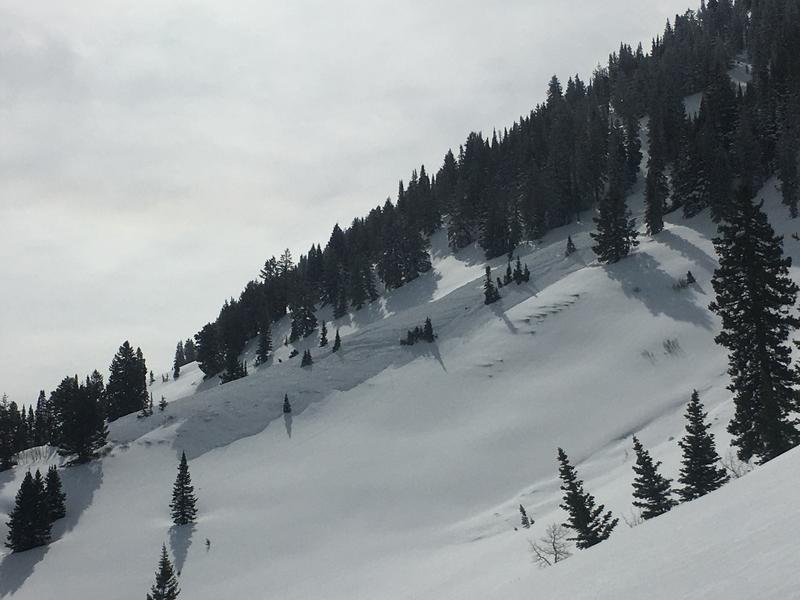 Came across a very recent natural avalanche up Providence Canyon on the NW side of Millville Peak. The crown broke ~100' wide just below the summit ridge line at ~9200' on a broad wind-loaded NNE aspect. Measured the crown slope angle at 39 degrees. The 20" wind slab failed and ran on the old melt surface crust for ~800' vertical. No visible trigger. Heard audible collapsing snow in the vicinity.
