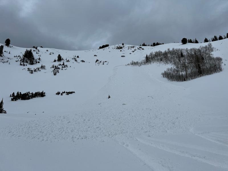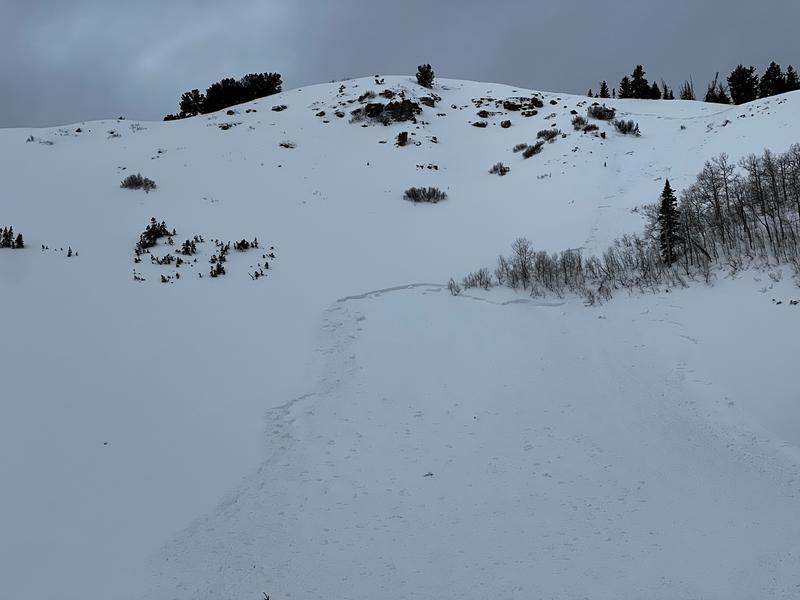 Remote triggered from 1000' to 1300' feet away, about 200' away from the bottom of the slope. Wind loaded slope/slab broke on old nasty layer below. We did not venture up the slope to inspect it any closer.