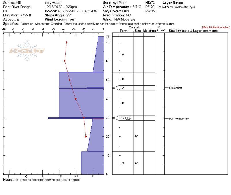 I triggered three large whumpfs. I could see hairline cracks up to about 60 feet away with a couple of them. I dug down into the snow and found a persistent weak layer of very loose sugary faceted snow... Even after the whumpf I got a test score of ECTP 10 in a snow pit that I dug in the same location