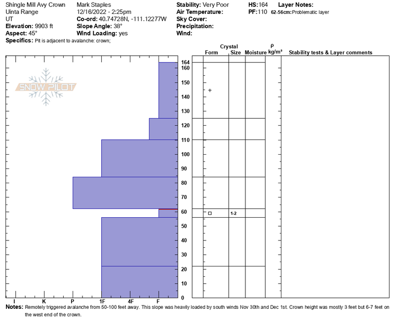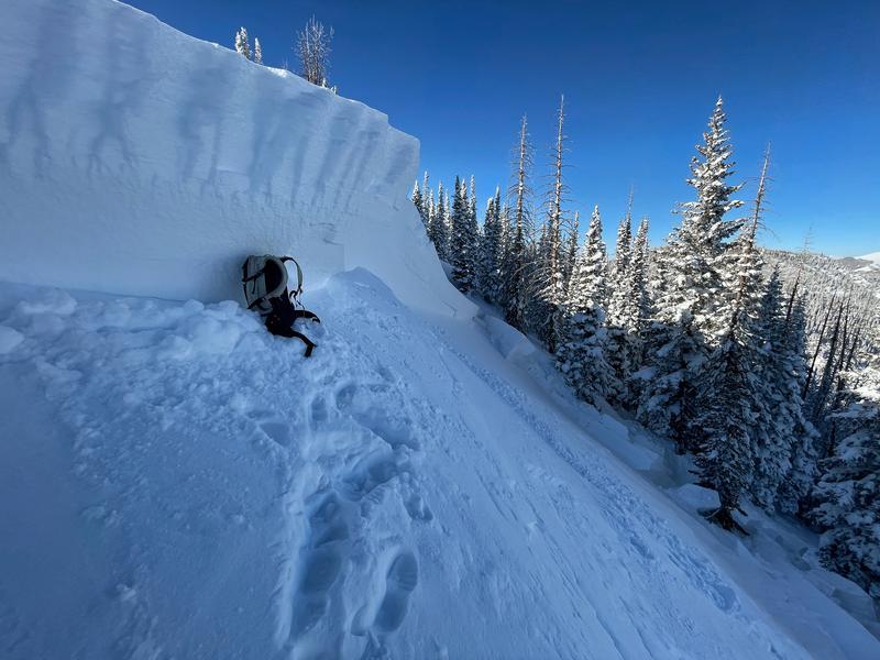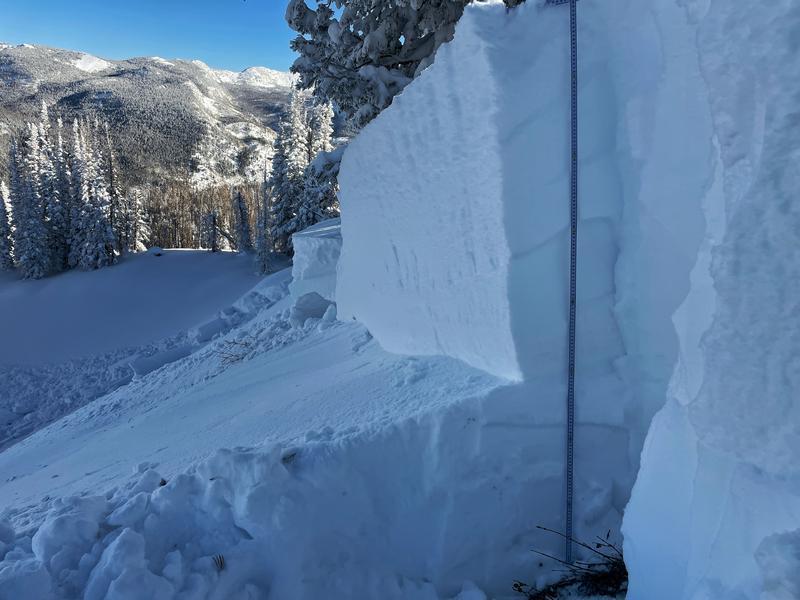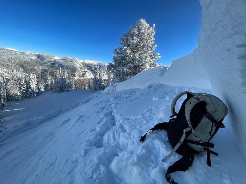 Remotely triggered this avalanche on 50-100 feet away on flat terrain. This slope has been loaded by south winds creating a hard slab on top of the mid-November weak layer of facets. Remotely triggered slides are a major red flag. Additionally, I was surprised that this slide was so easily triggered with such a hard slab over the facets that makes it harder to trigger.