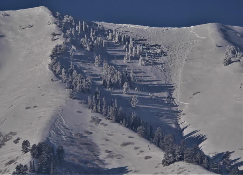 It finnally cleared up and we could see more recent natural avalanche activity in the Wellsville Range, including this broad one in the southern bowl of Gibson Canyon.