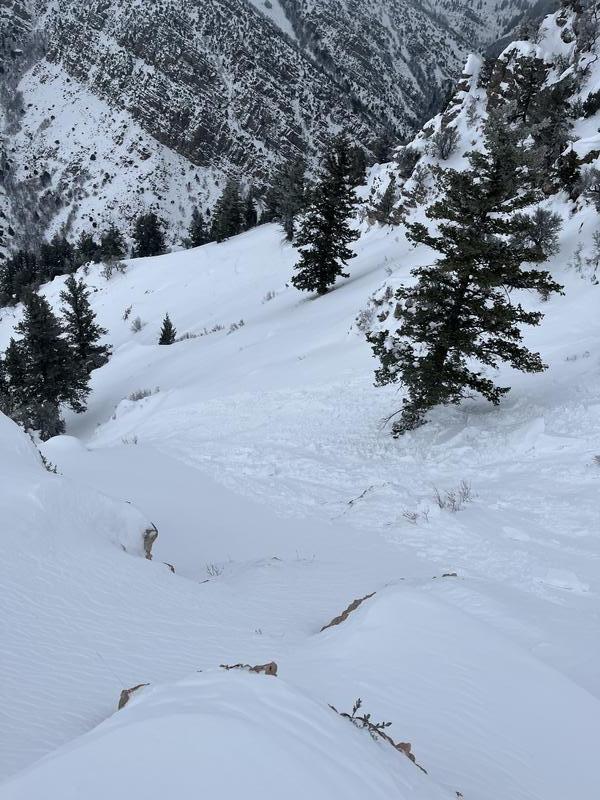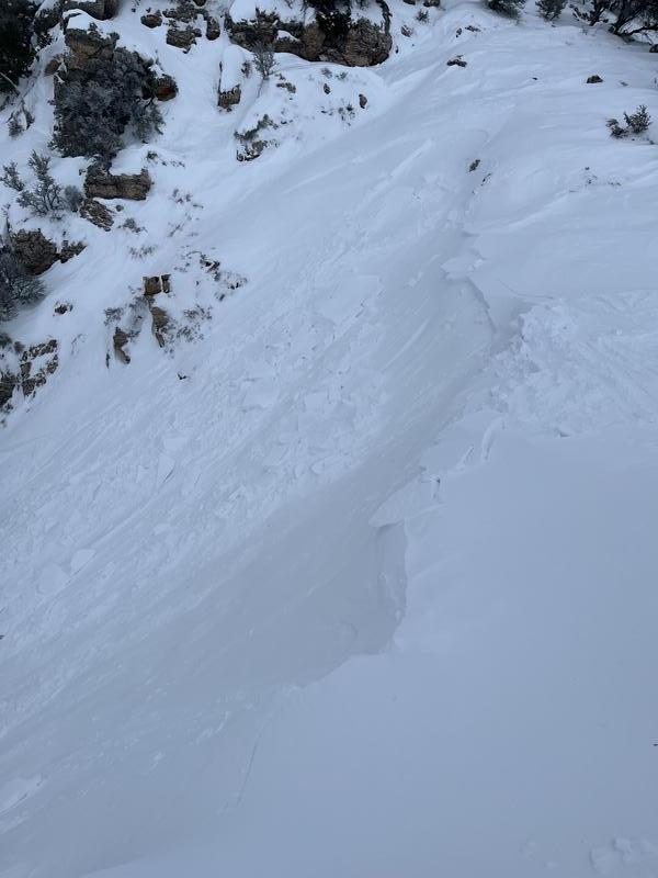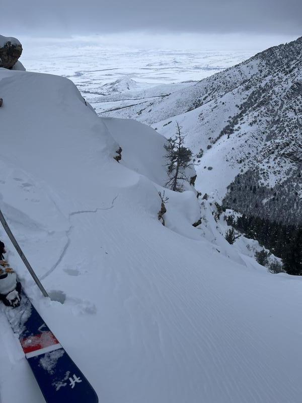 From the safety of the ridge my party remotely triggered a slab avalanche on a Northern facing slope that descended toward cherry creek. It fractured first on a wind loaded cornice and propagated in both directions about 30ft.