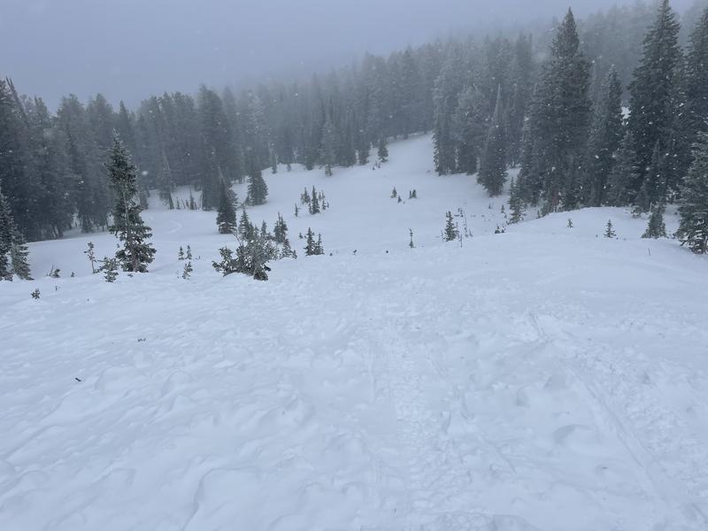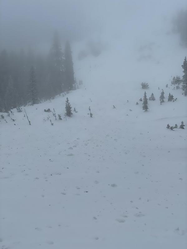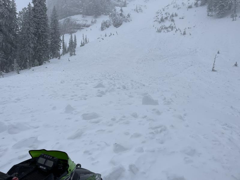 I was riding nearby trees when I spotted debris field. This was a long running and powerful slide! Based on fresh snow over debris it was from 23 Dec.