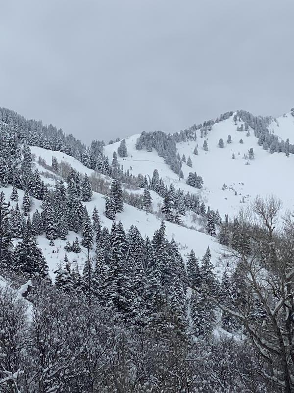 Saw the crown of this avalanche in Bartholomew Canyon South Fork at around 3 pm today. It must have been decent and natural: no other tracks up the canyon since the last snowfall, and the avalanche appears to have shaken the snow off the two small trees at its crown! Didn't get close to investigate, but the crown looked tall to my eyes.
