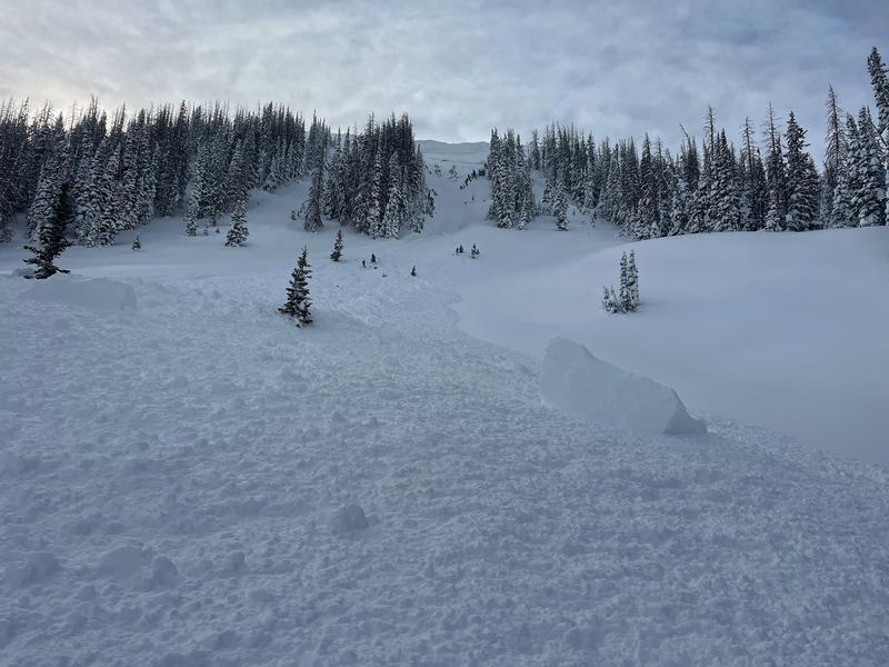 Dimensions are estimates. Definitely cornice triggered. See the cornice chunks in the photo. It definitely occurred within the last 24 hours.