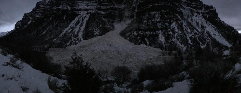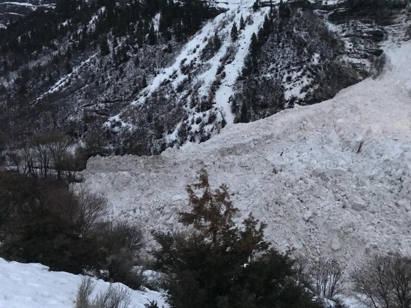 This avalanche ran naturally this morning. It put snow onto the county road next to SR 189 and dammed the Provo River.
