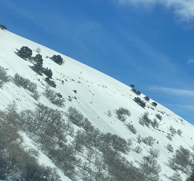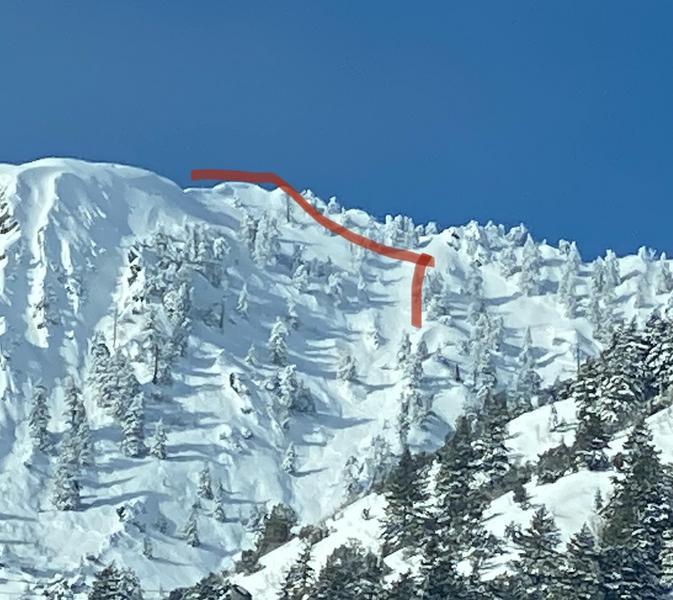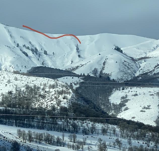 Saw several new slab avalanches this morning up in the Wellsville range that seemed to have failed within the new snow or on the new/old interface (most likely with the help of the wind) on east and southeast aspects. Red lines make it easier to see crown as pictures are from far away. On southerly slope at lower elevation along the highway was some rollerball and wet loose activity at around noon.