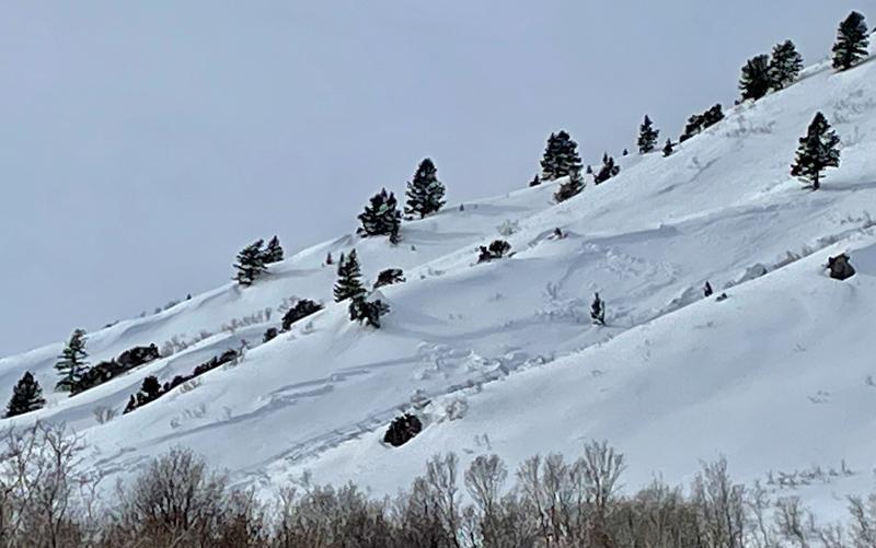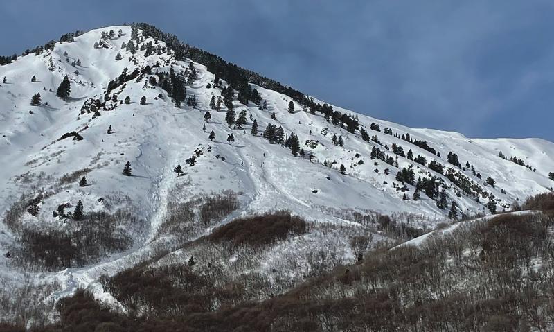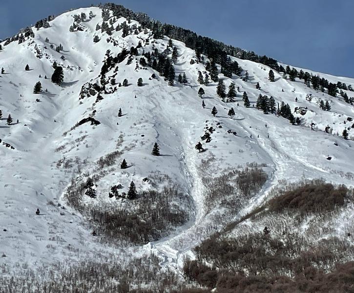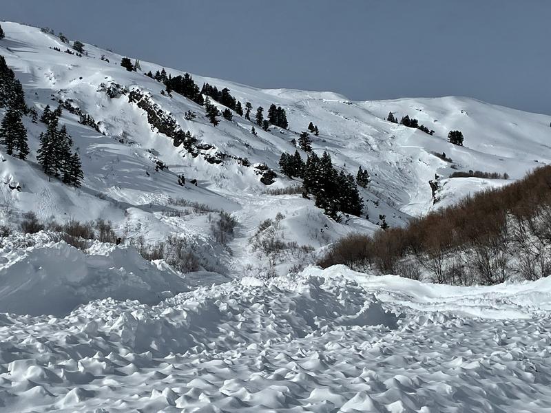 Huge natural hard slab avalanche(s) crown appeared to be connected, stretching across Mitton Peak and Rattlesnake Headwall, and bringing a huge pile of (wet) debris down to about 6200' in elevation. Debris pile hard to describe with words and fairly difficult to travel on.