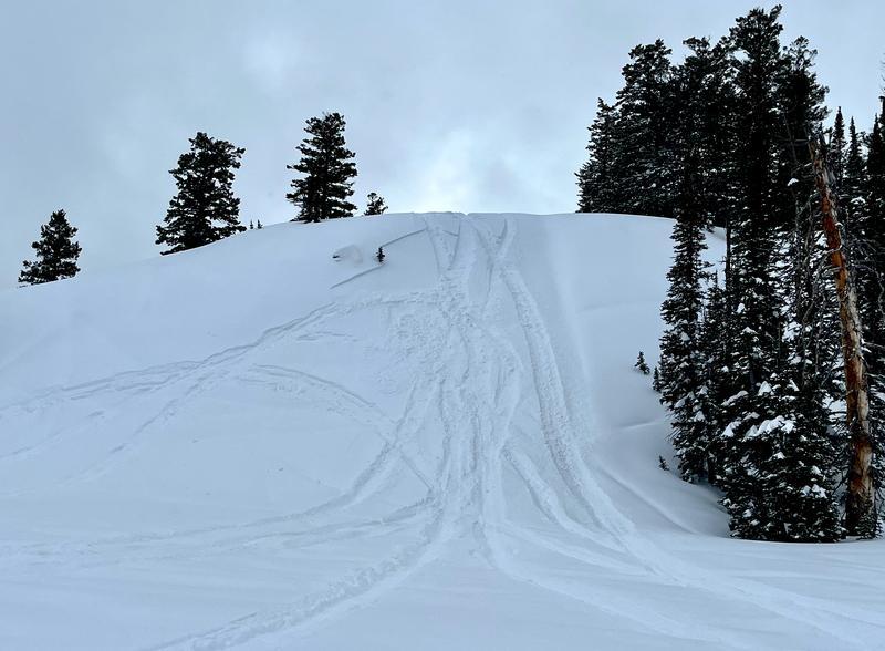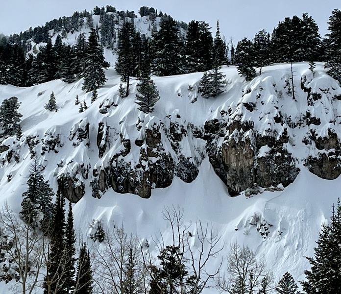 We could see a small snowmobiler triggered slide on a small slope south of Mt Magog. There were also a few similar small natural avalanches of wind drifted snow including this one below the cliffs north of Tony Grove Lake...