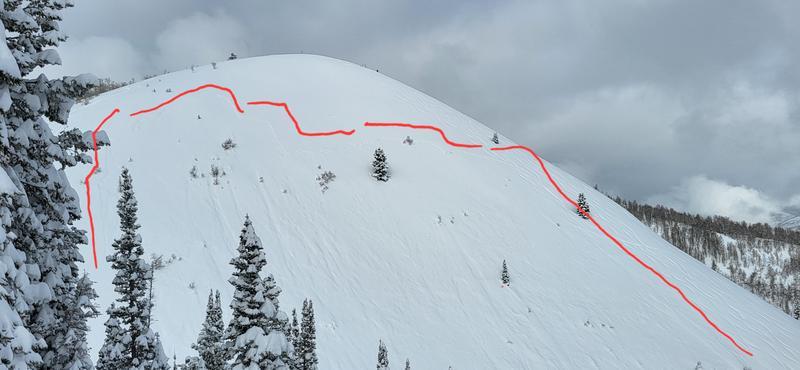 Another party also spotted a crown above the same gully in the NE trees of Bob's. We also saw evidence of flagging coming out of those trees. Was that triggered by this larger avalanche on Sue's?