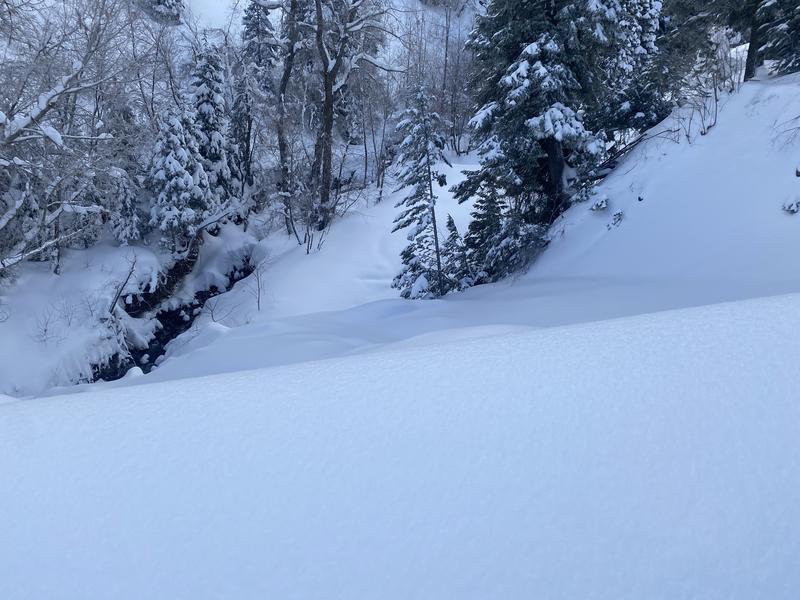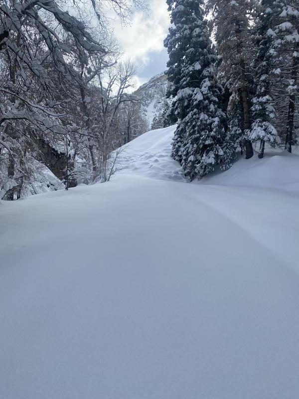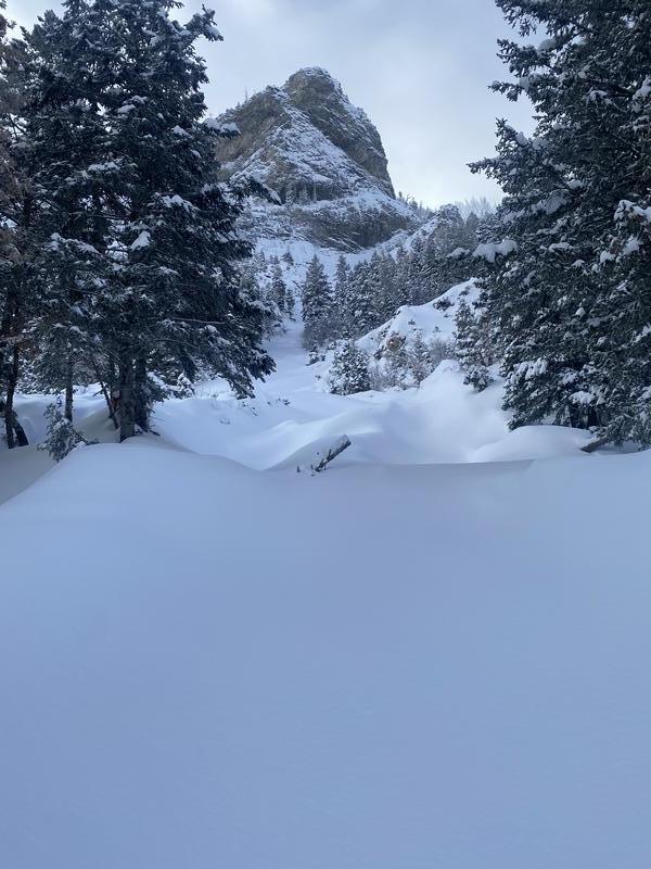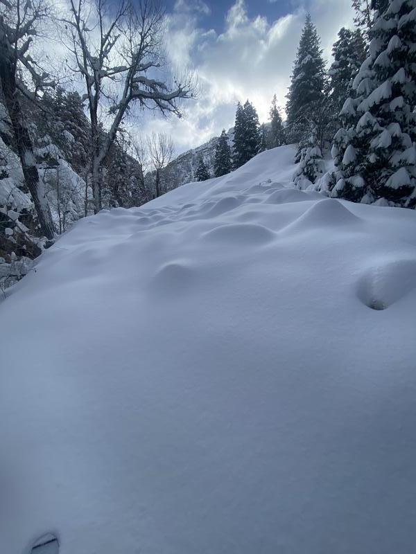 This avalanche happened a few days before yesterdays storm. It had fresh snow on top. I could see the slide for atleast 500-600 feet. It fully covered the road and is 40-50 feet high at the highest point on the road. Completely cleared the whole path of any trees and there were multiple trees 2-3 feet in diameter on either side of the path. I couldn't see the starting line without skinning up further. There was another avalanche just slightly smaller a half mile down the road.