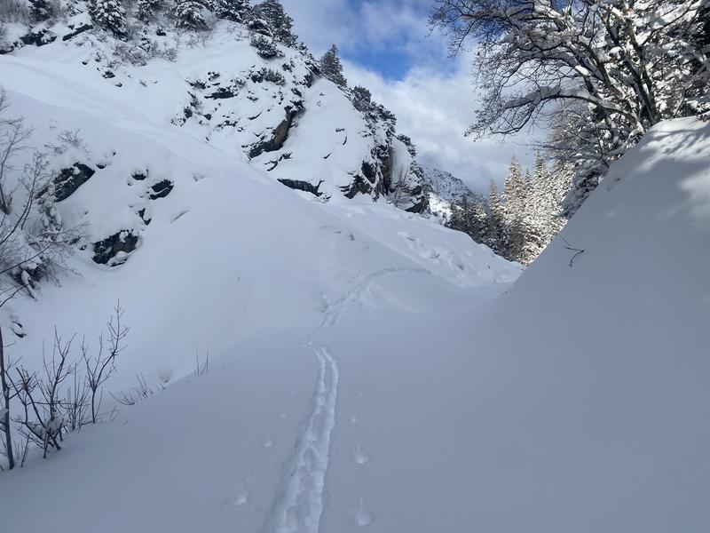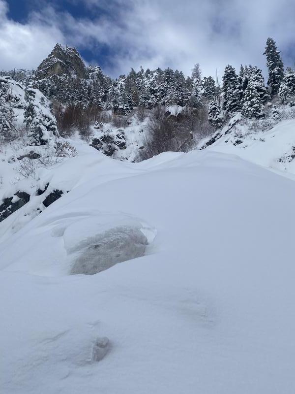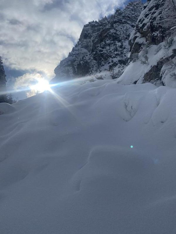 One of two avalanches seen on todays tour (the other was approximately a half mile further up the canyon). This one came straight down the canyon above the road and ran out until it hit the bottom (approximately 400-500 feet). I wasn't able to see the starting point due to the new snow. Multiple 2' trees and blocks of ice 6 feet or wider in the debris field. It covered the entire road and filled up the river. 20-25 feet tall at the highest point in the debris field.