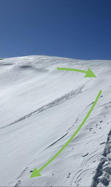 What a difference a day makes! We wanted to check out the southern part of the range after the report from yesterday. We figured we could find some aspect that had not been hammered. We checked south and west facing areas and eventually settled on north facing trees, which skied well. On the way there though we triggered this very small slide from well over 200' away. The hairline cracking propagated over several hundred feet and grew in width to an inch or so. The cracking started at the top of the first arrow and continued past the second. The whole set up was right out of the report today and slabs sensitive to body weight have clearly formed on above tree line leeward slopes. The trick is that leeward seems to be about 2/3 of the compass, at least in this area.