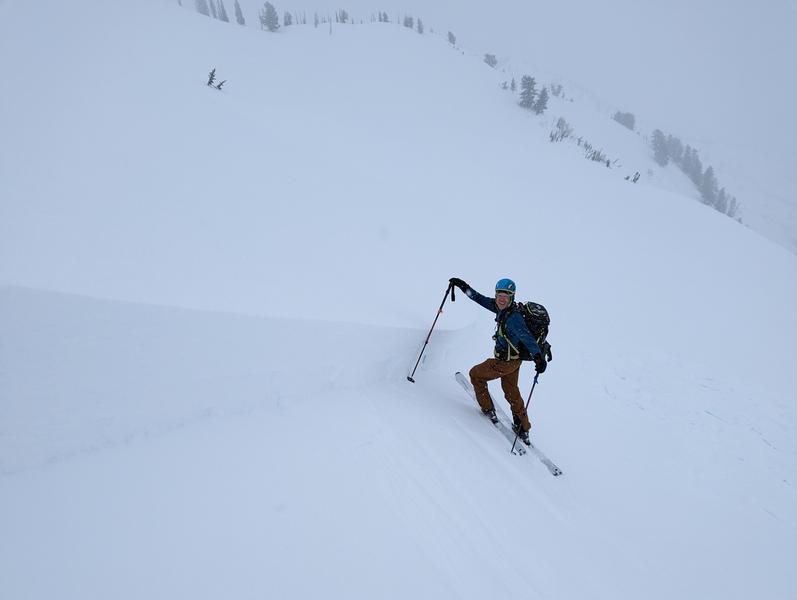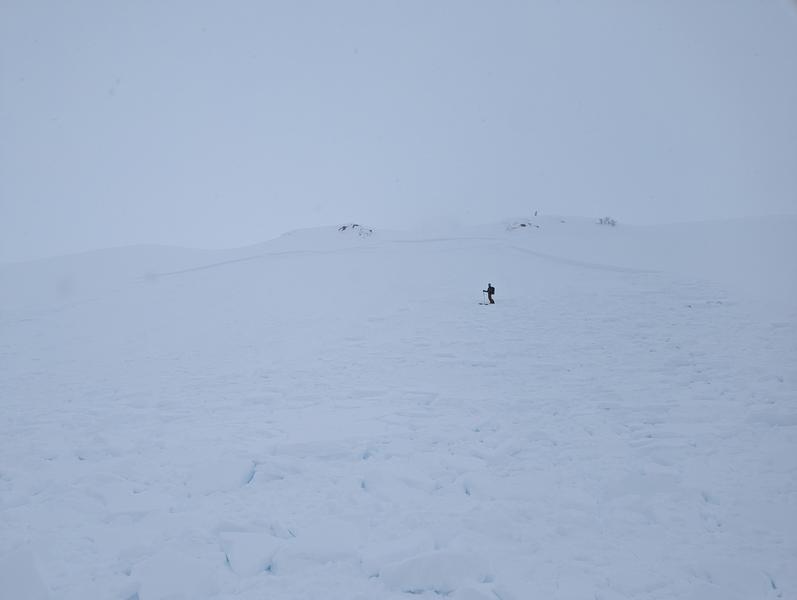 We triggered a wind slab at 9400' on an East-facing slope while skinning up Bunnell's fork. Crown was about 150' wide and 10"-24" thick. The slide went about 100' then stopped on a lower angle slope. Avalanche broke about 20' above skier, who was then carried about 60'. Second skier observed from an adjacent slope and was not carried. No injuries and no burial. We heard and felt a loud whomph about 1 hr before this, so we tried to stay on low angle terrain, but with low visibility ended up on a steep slope anyway. Should've turned around when we heard the whomph.