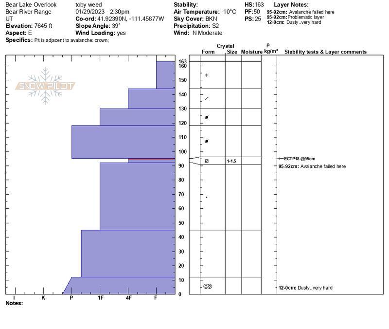 I went up to examine this avalanche on Sunday (1-29-23) I found that the avalanche failed on small-grained faceted snow that was on the snow surface during cold weather a couple weeks ago. (Near surface facets or NSF) This is a buried persistent weak layer , but this type of instability usually heals fairly quickly. Toby Weed