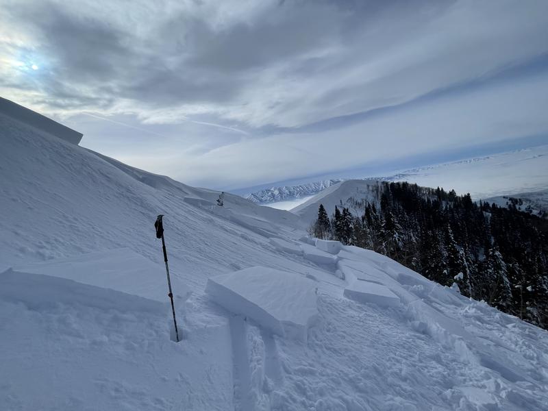 As forecasted, "Avoid corniced slopes and stiffer drifts on steep slopes near ridges." I intentionally triggered the slide in such a spot with one step on the slab.